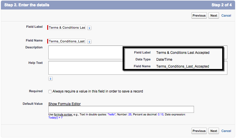 Lets get started! Create a Custom Date/Time Field on the User. Label this field Terms & Conditions Last Accepted (Setup | Customize | Accounts | Fields)