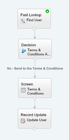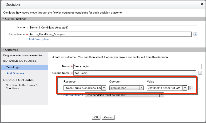 Now that we have the User’s data, we want to determine if they have accepted the Terms & Conditions or not. So lets create a Decision element. Keep in mind – this is one of the two areas you will have to update when you make changes to your Terms & Conditions. You need to manually update the Date/Time Value that you are basing your Decision off. For the Resource that we will use in this Decision, we want to go inside the User variable and grab the Terms & Conditions Last Accepted. Now we can setup our filter criteria to determine if the User has already accepted the Terms & Conditions, and if they have we want to let them login without going to the Terms & Conditions Screen.