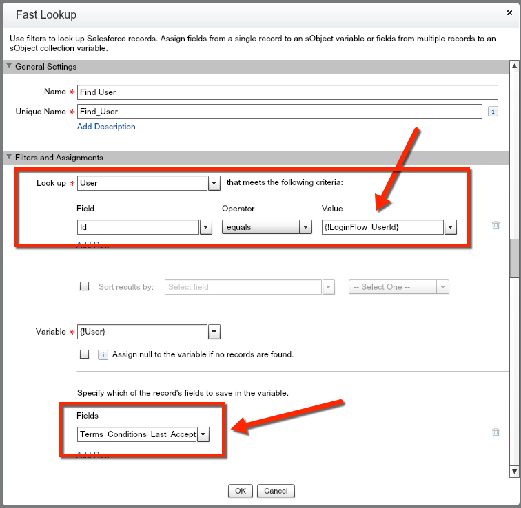 Lets start with dragging in a Fast Lookup. We want to do the Look up on User Id equaling the LoginFlow_UserId. Remember, your variable MUST be labeled this exactly or the User Id will not pass into your Flow. After we have done that, we want to grab the Terms & Conditions Last Accepted from the User attempting to login to Salesforce.