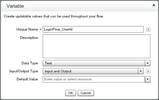 Login Flows are a bit weird as you don’t get your own naming convention for some of the input variables you want to use (the Id for the User logging in). Reference the full list of of input and output variables that are available to you here.