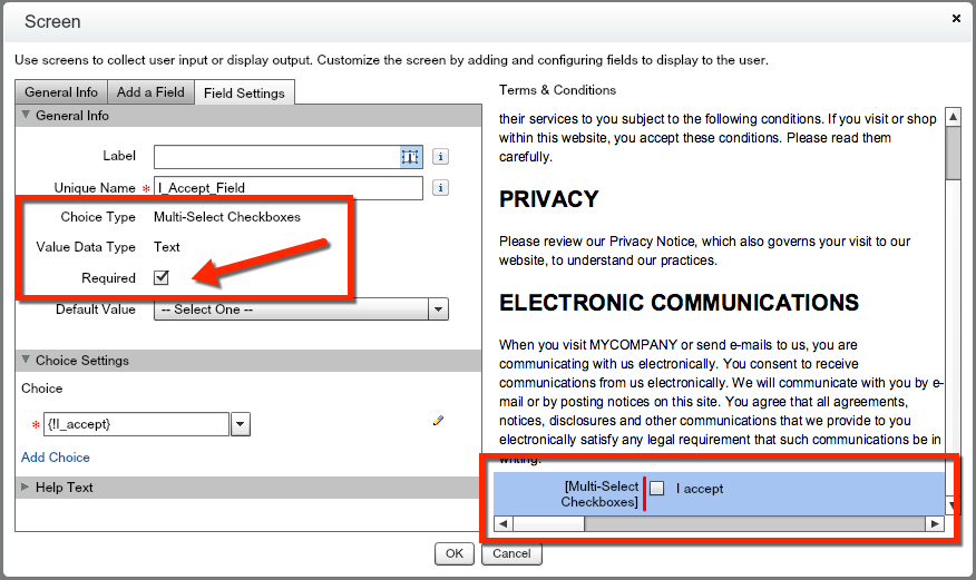 Now that we got the legal jargon taken care of, we need to create a Multi-Select Checkbox and add that below our Display Text. For the Label, keep it blank so that you have no excess text on your Screen. You want to check the Required box so that one of the Multi-Select Checkboxes has to be chosen to move to the next screen. Then you want to create a Choice called “I accept” to be your only Choice for the User. This will allow us to have a validation rule to only login users that accept the Terms & Conditions.