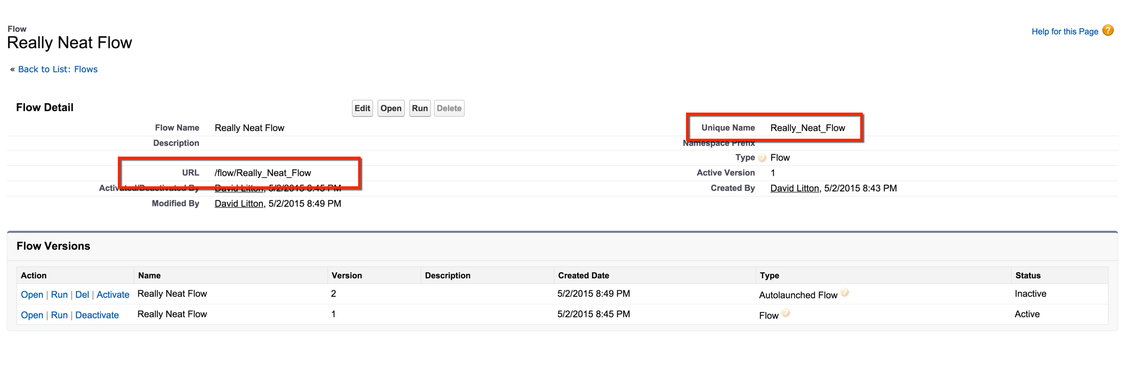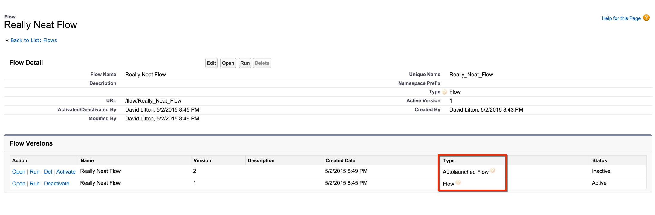 Delete – deletes the Flow. There used to be a 24 hour time delay on deleting Flows that have recently been active, because you have to give all potential users the chance to finish navigating their Flow before it is deleted… however that has been abolished now that Flow & Process Builder have taken over the Salesforce world. Delete the Flow whenever you feel like it now, just be careful as they are not going to be waiting for you in the Recycling Bin!