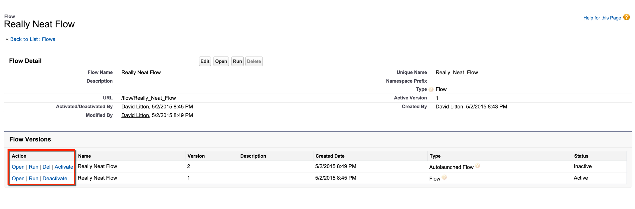 You will notice that under Flow Versions you have five Actions: Open, Run, Delete, Activate, Deactivate.