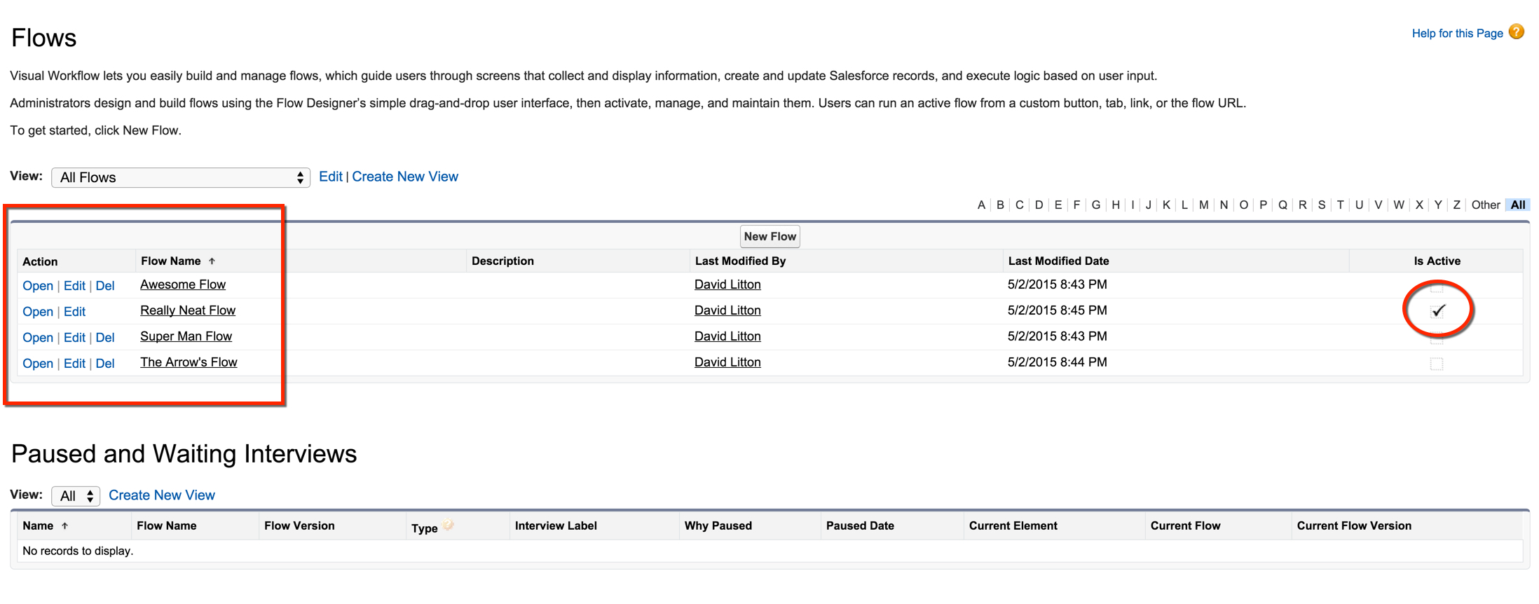 Now we are at the “Home Page” of your org’s Flows. From here we see an overview of ALL of our Flows in the org. Below your listed Flows, you can see the Paused and Waiting Interviews. Here we are viewing all of our Flows, and we can easily see which ones are active. If you Create New View and customize your columns, you can add: Unique Name, Is Using an Older Version, Last Modified Date, Namespace Prefix. I find adding Unique Name to your layout helpful.