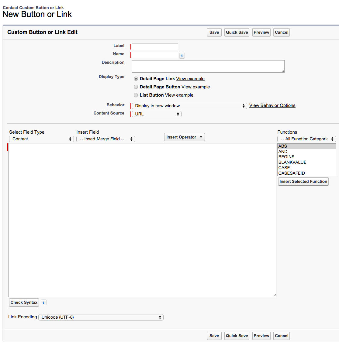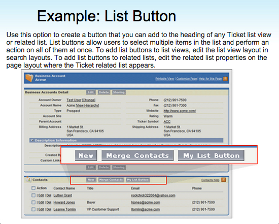 The List Button display gives you the ability to do some pretty cool things. This is how you would create a Button to show up on List Views and on Related Lists of records. Note, that if you were to create this display, it does not also function as a Detail Page Button, you would have to create another Button for that purpose.