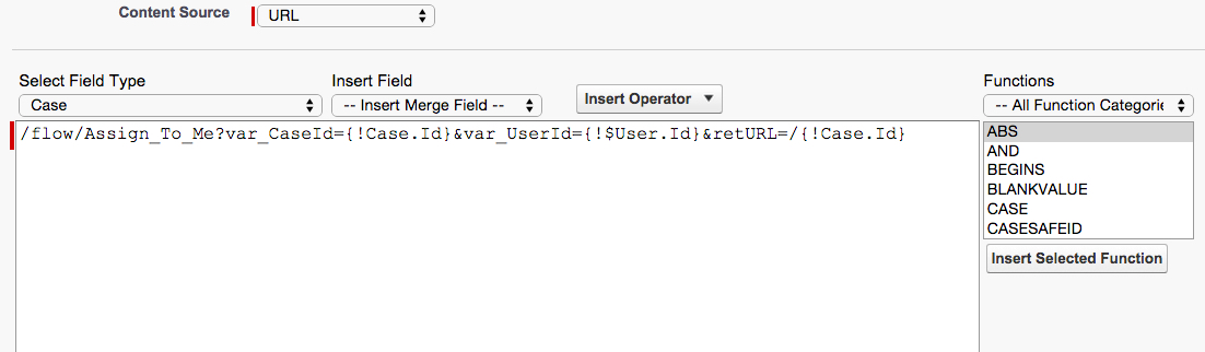 If you select the Content Source URL, you will be given a editor to create your URL. Here you will be able to edit place a URL string that will launch your Flow. Don’t forget to use the “Insert Merge Field” assistance that Salesforce has provided you, it doesn’t bite!