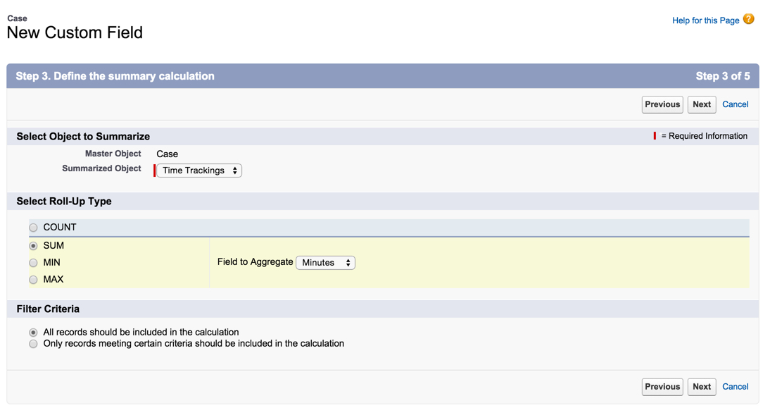 Awesome, we are now done with our Custom Object! We need to go navigate to our Case Object and create a Roll-up Summary Field to summarize our Minutes from the Time Tracking Object we just created. This way we can see the running total of all Users that worked on the Case. If we want to view reports based on individuals, we would simply need to run a Time Tracking report or look at the Related List.