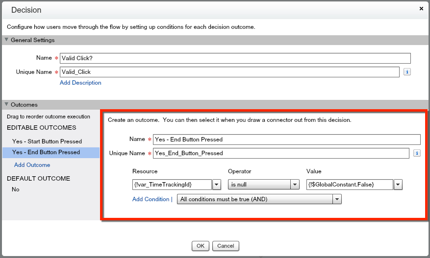 For our first Outcome, lets determine if the Start Button was pressed, and if there is NOT an existing Time Tracking record for this Running User. To do this, we will see if our var_Start was populated on the click, and if var_TimeTrackingId is null. If both of these are true, we want to pass the Flow