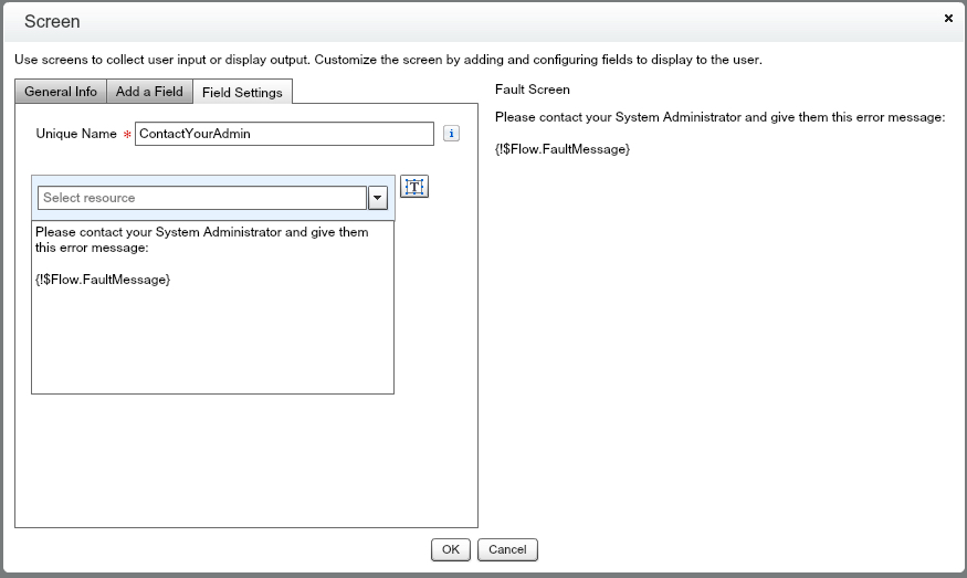Now, the only thing left for us to do is create a FAULT Screen in case something errors. We don’t want to confuse our Users. To do this, we simply add a Display Text field to our Screen, and then type in our Fault Message. After you’ve created this Screen, connect your Faults on your Record Lookup/Create/Update to the Screen. Since this is not an Autolaunched Flow, we can keep this screen here as we Save.