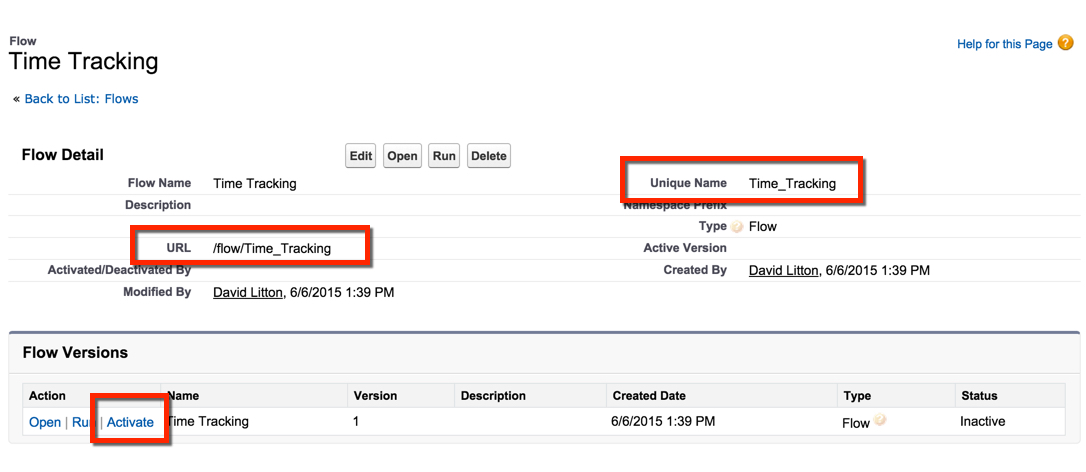 Now that we have our Flow saved, lets navigate back to our Flow Detail page and do two things. First, lets activate our Flow. Second, lets grab the Unique Name (or URL) and get ready to use it in our Buttons!