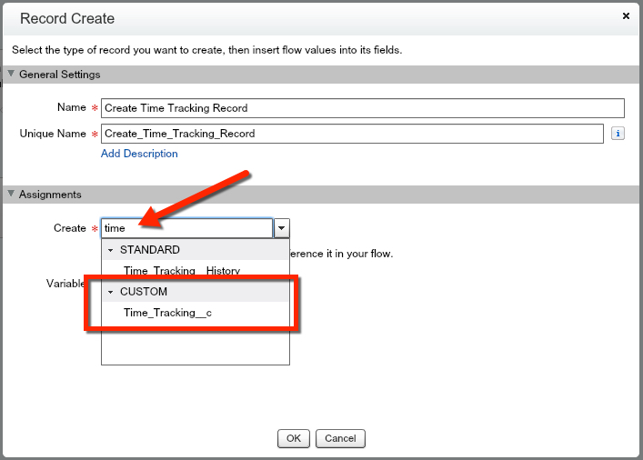 Alright, now we need to setup the Record Create for our “Start” Button being clicked. So lets grab the Record Create element and search for our Time Tracking Object.