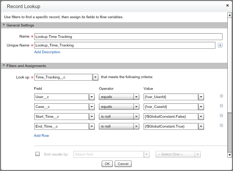 Lets start our Flow off with a Record Lookup. In this Lookup we will be searching to see if there is already an open Time Tracking record. This will help us determine if the clicks on our Buttons are valid, or if they were accidental. So, we want to search for a Record from the Running User that has a Start Time, but does not have an End Time, which means they are still Open.