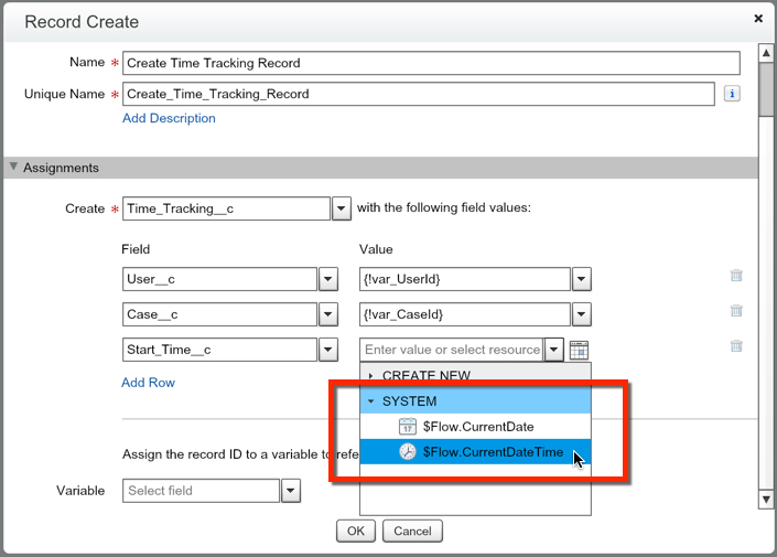 Now, lets determine what our New Record will look like. We want to map our UserId, CaseId, and the current Date/Time to the new Time Tracking record. For creating the Start Time value, we want to use the SYSTEM field “$Flow.CurrentDateTime”.