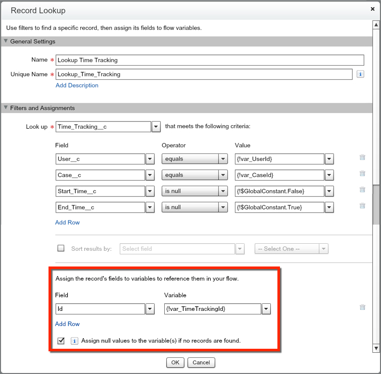 Now that we have our criteria set, lets assign the Id of the record we may or may not find to be referenced in our Flow. To do this, we will need to first create the new Text Variable “var_TimeTrackingId”.