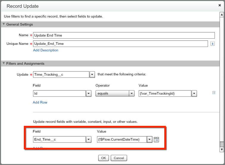 Great job, lets now create our Record Update to add the End Time to the Time Tracking record if the End Button was pressed. For this, we will once again search for the Time Tracking Object, search for when the Id equals our “var_TimeTrackingId”. We then want to update the “End Time” field with the current Date/Time. We will do this again using the SYSTEM field “$Flow.CurrentDateTIme”.