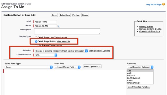 Click Save, and you are done! Now you can add the Assign to Me button to your Page Layout(s) and snipe the easy cases from your coworkers using the old school ‘Change Owner’ method.