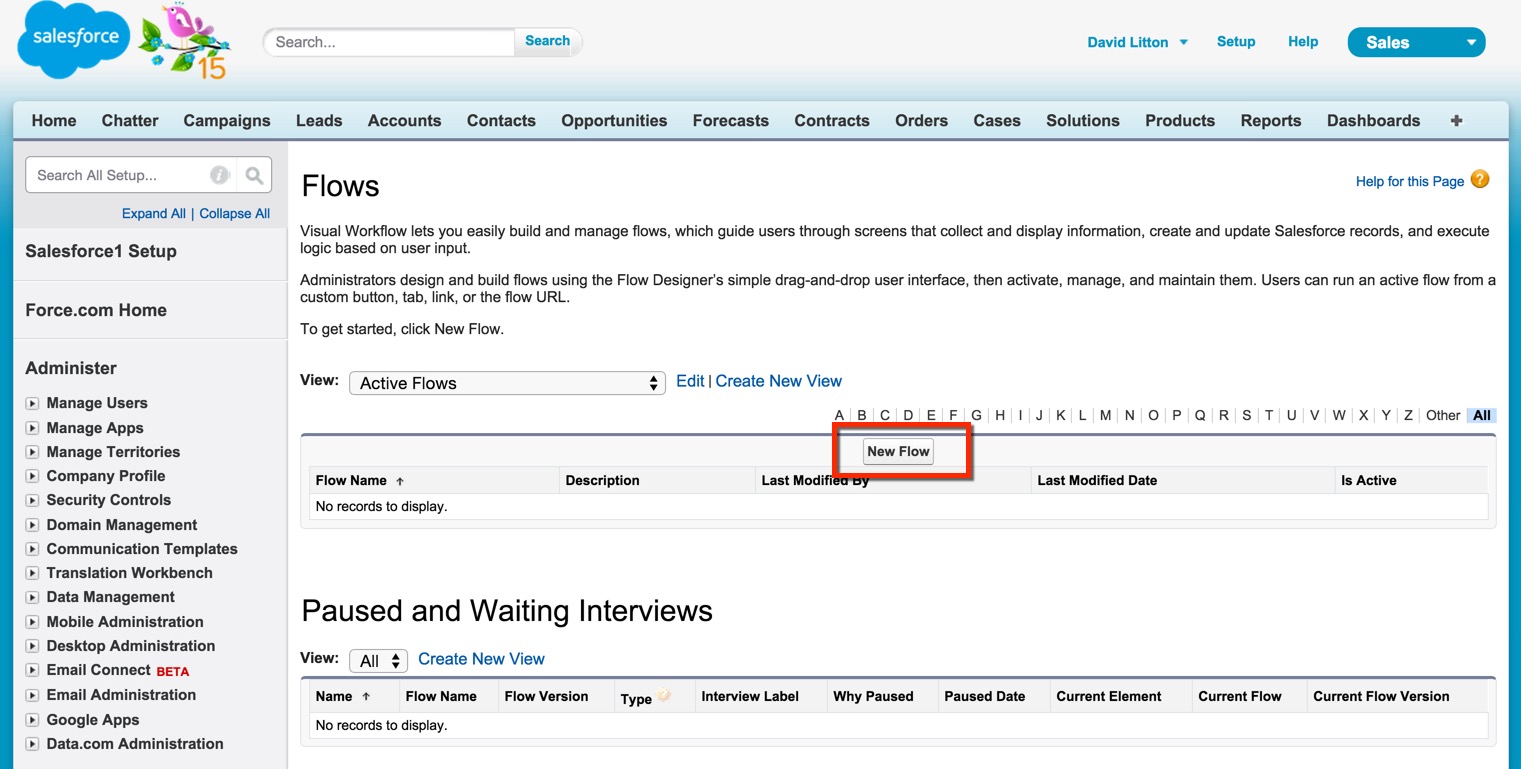 Lets begin by navigating to the Flow (Setup | Create | Workflows & Approvals | Flows)