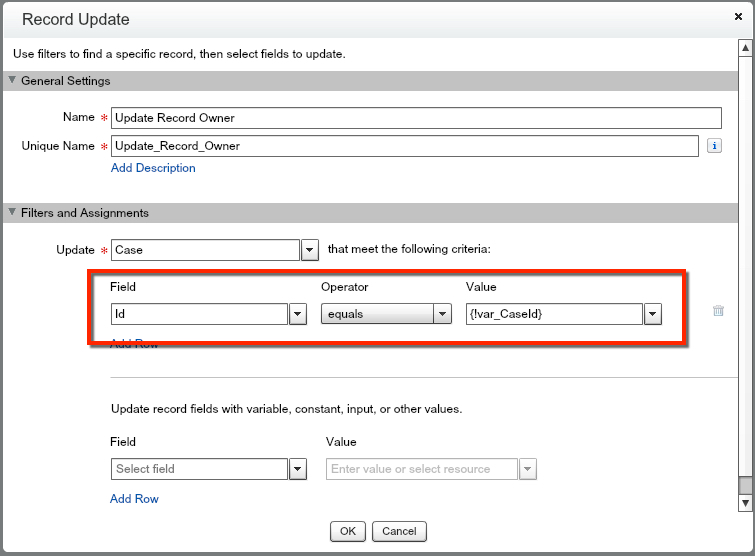 After you Select the Case Object, we need to filter it based on the CaseId. So lets select the New Variable and make our Text Variable var_CaseId. After creating this Variable it will populate in the our criteria. That’s one perk of creating these variables on the fly.