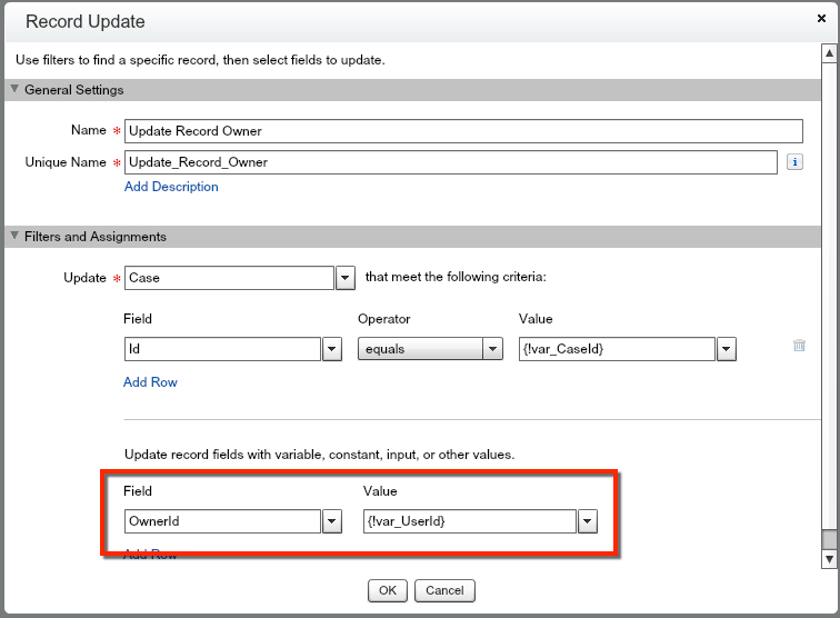 We’ve found our ‘Record’ by filtering on the var_CaseId. Now, we need to update our Case with the OwnerId being the Running User’s Id. To do this we need to create a new variable called var_UserId. This is where we will pass in the UserId of the Running User (the person who pressed the Button).