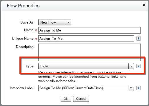 Notice I am saving this as a Flow and not an Autolaunched Flow. It doesn’t make a difference because an Autolaunched Flow can still be launched from a Button, but I do it to let myself know this is meant to be triggered from a Button.