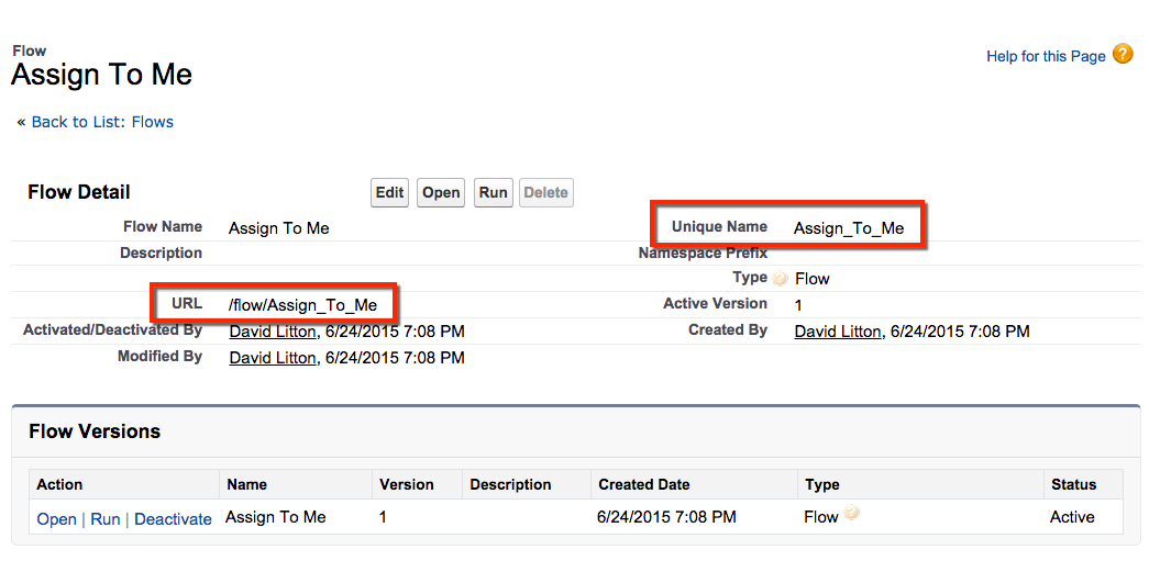 Now, on our Flow Detail page we can see our Unique Name (API name for the Flow) and our Flow URL. We are going to be using this in just a second to create our Button’s URL that will do all the magic!