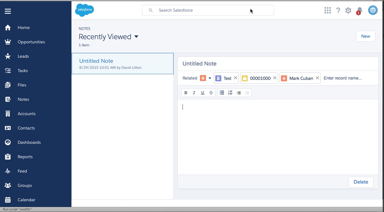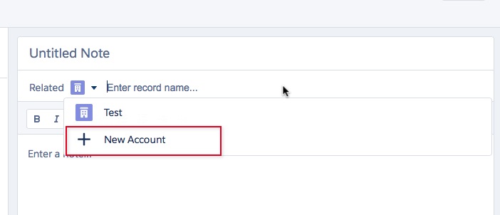 So, one awesome thing about Notes is you can keep relating different types of Objects to it. I haven’t looked on the backend of this to see how its working and what tradeoffs we will have to deal with, but this is pretty cool to be able to associate a Note to tons of different Object types. You simply select the Object’s Icon and then you can either Create a new Record from within your Note or search for an existing one. The new record is created ‘in-screen’ so you aren’t even redirected anywhere! This is a great feature I am sure we will see added to most Lookups in the future.