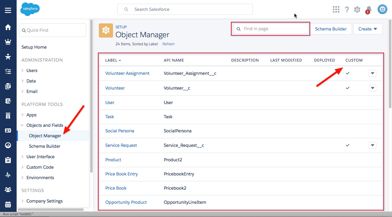 There are two parts to this! I’m a huge fan of these update, as it really just simplifies everything! The first update is that all of the Objects (Standard and Custom) are in the Object Manager section of the Setup Menu. If you click on this you can see that we even have a ‘Find in page’ search bar for just these objects! I really think the combination of these two features makes it easier for a new Admin to find the Objects they’re looking for.