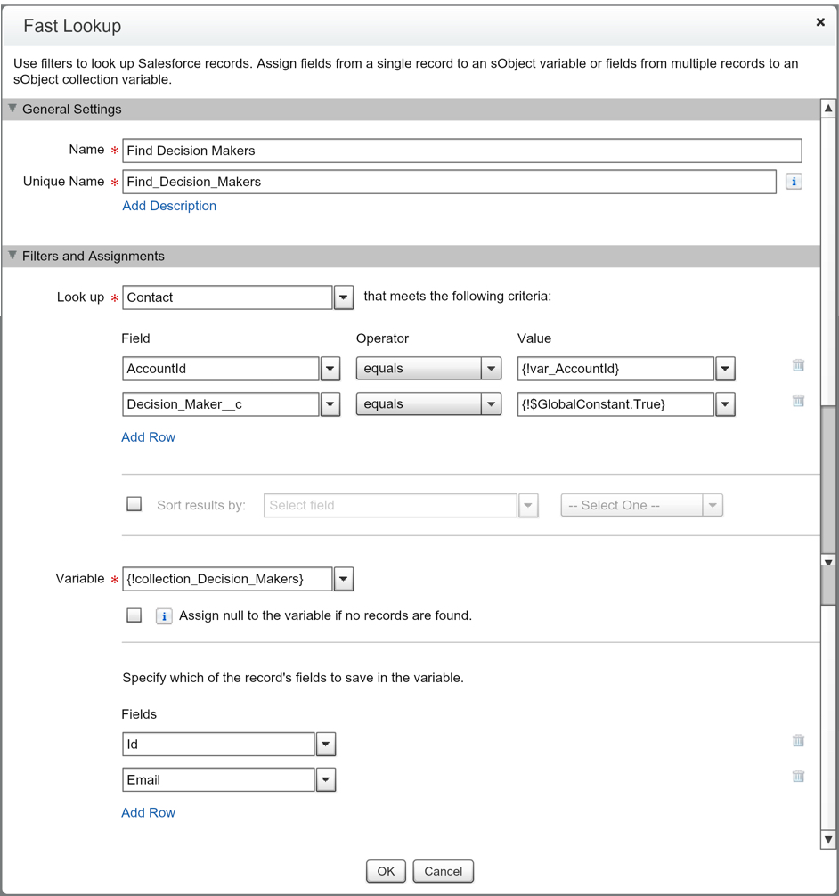 Now, we need to grab all of the Contacts on this Account that are decision makers.  We have a Custom Field called Decision Maker, and it is marked as TRUE when they are one.  We have also passed the Account.Id into our Flow’s variable var_AccountId.  So, using those two fields we can filter through all of the Contacts that meet our criteria.  Notice, instead of making a formula or setting a variable to make sure that Decision Maker is TRUE, we can use the {!$GlobalConstant.True} field.